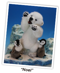 The scene I tried to recreate here is one filled with joy as a baby polar bear, born during the cold, cold winter inside a den in the snow, comes out for the first time into a world of sunshine and ice. The ice in the diorama was created by rolling up newspaper and creating the shape with diorama tape, then covering it with clay, adding color, and pasting on Swarovski crystals to show the sparking of the ice.